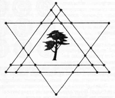 У саду росте 27 дубів так, показано на малюнку. Потрібно пересадити їх так, щоб всі 27 дубків стояли знову в 9 рядів по 6 дерев у кожному - і жодного дубка осторонь.