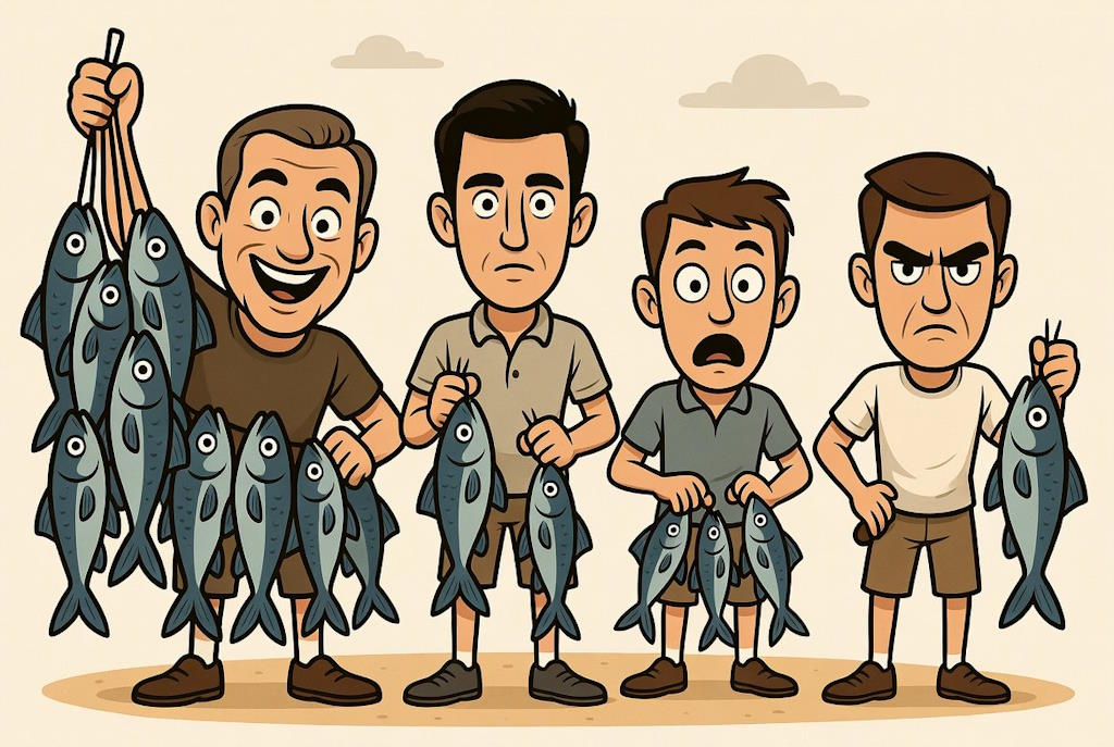 Рибалки Адам, Бауер, Крістіансен і Дазе (скорочено А, В, С и D – по перших латинських літерах їхніх імен), зваживши свій улов, установили наступне: (1) D піймав більше, ніж С. (2) А и В разом піймали стільки ж, скільки С и D (разом). (3) A і D разом піймали менше, ніж В и С (разом). Розташуєте результати зважувань уловів а, b , с и d . рибалок A, В, С и D по величині.
