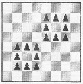 На шахівниці розміщено 16 пішаків так, як показано на малюнку. Скільки знадобиться ходів конем, щоб побити всі пішаки. Нагадаємо, що кінь ходить буквою «Г», яка може бути спрямована в будь-яку сторону або може лежати.