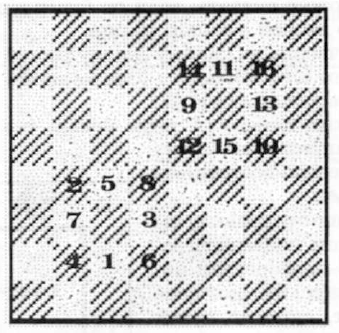 Знадобиться 16 ходів, з якої би клітки ви не почали. От наприклад почнемо з лівої нижньої клітки. Ходячи за своїми законами, кінь буде збивати пішаків в тому порядку, у якому зазначені їхні номери на малюнку.