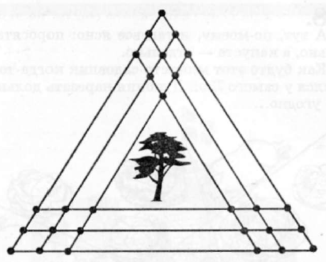 У саду росте 27 дубів так, показано на малюнку. Потрібно пересадити їх так, щоб всі 27 дубків стояли знову в 9 рядів по 6 дерев у кожному - і жодного дубка осторонь.